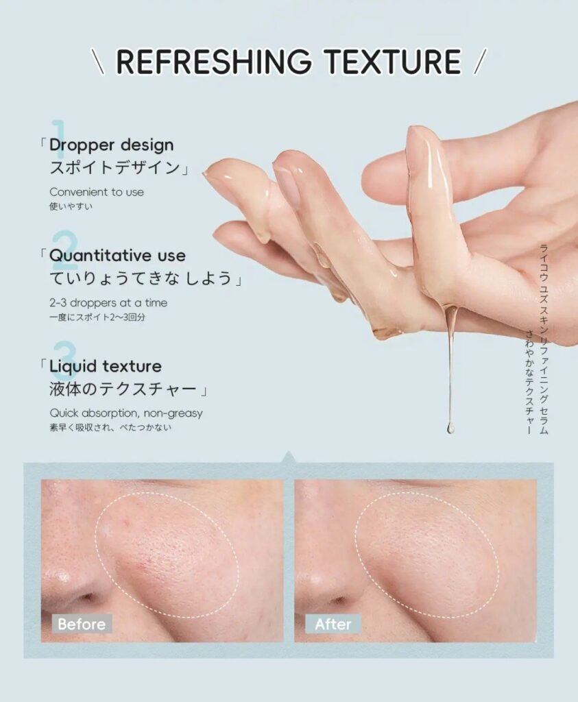 Our pore refining serum nourishes skin tissue and reduces various skin problems. This product relieves skin dryness, roughness, dullness and repairs damaged skin.